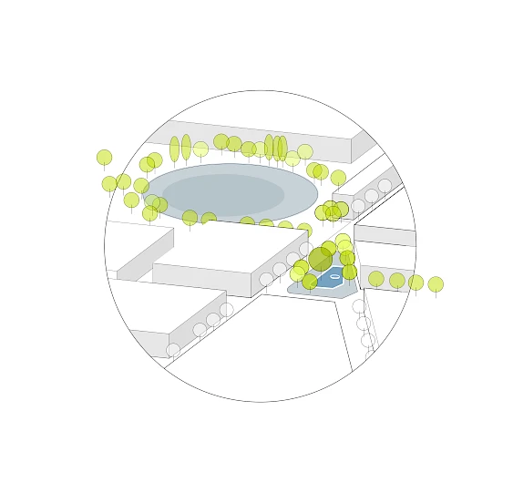 Embedded in the dense urban space and still of great importance as an open space – two worlds converge at Franz-Neumann-Platz: urban life meets light shadow play. Plain and high-quality pavement integrates the square into the surrounding urban space and forms a nearly seamless link to the green spaces around the Schäfersee lake. Two slightly raised planting areas developed from the existing structure separate the square from traffic. Inviting and openly designed entrances connect the edge to the centre. The loose, partly dense tree population will be carefully supplemented and further developed. A shaded area “under the cover of trees” merges into the open promenade with south-west exposure in front of the development. The open centre of the square becomes an urban stage, accentuated by the fountain, which is fitted flatly into the relief.
