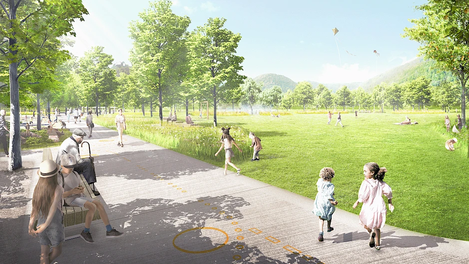In the transition between the elongated settlement area of Bad Urach in the valley and the adjoining landscape space characterised by open expanses, a variety of park spaces are created along the swinging blue ribbon of the Erms. Each one is spatially and atmospherically independent and characteristic in terms of its inventory, offerings and situations along the river. The discovering walk along the Erms, through the upgraded spa park and "the two new ones" offers a sequence of impressively intense experiences as well as an interplay of small-scale, diverse situations and generously open meadow images, connected by a pathway developed from the existing ones. Between the Kurpark, Bürgerpark and Auenpark, this is qualified in its profile and accentuated by the accompanying squares and bridges as a circular loop. The "Spielspange" in the Bürgerpark in front of the new development and the "Kurspange" between the Graf Eberhard Hotel, the thermal baths and the Ermstalhalle form special places and link the fine network of paths, as well as other "Urach path nodes", to the surrounding urban and landscape space.