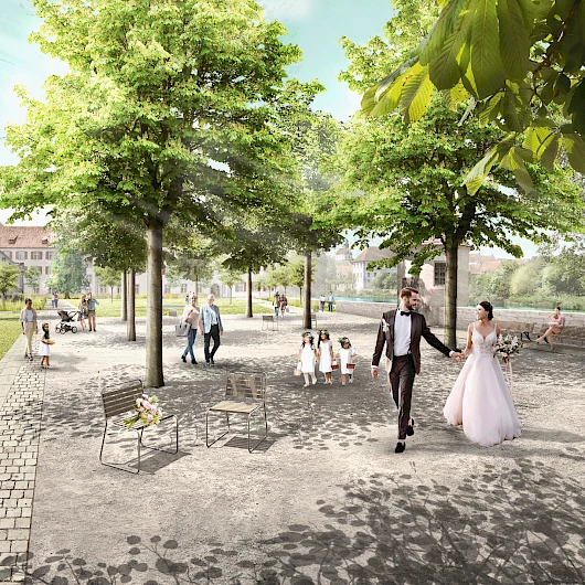 The monastery and its gardens, the entire island of Rheinau - built on and on over centuries and centuries - form a unique ensemble of layers of time, (open) spaces and different atmospheres. Each specific and impressive, they complement each other and act as an overall picture. The open space concept for the north shore of the island and the Spitzgarten establishes the reference to the multifaceted history and carefully continues to write the valuable open spaces from the inventory in a future-oriented way. Starting from the Rhine bridge, the accessibility and connection of the Spitzgarten is qualified by a direct promenade path with a slight curve. Precise interventions in the existing path of the Spitzgarten create a generously free and pleasantly simple lawn center, which spatially balances and holds together the set pieces from different time layers. A simple yet differentiated circular path circles the garden within the walls and opens up the subspaces - the walk through Spitzgarten as a loop and 'journey through time'.