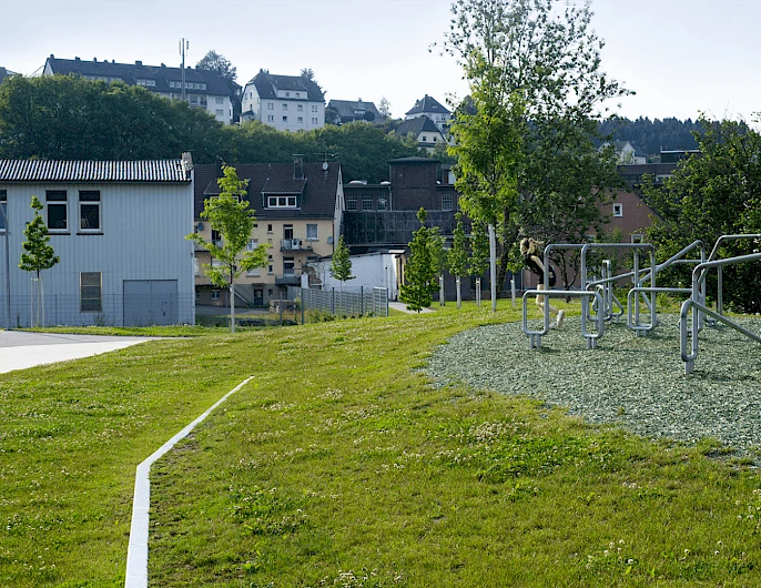 Kierspe, as a town in the western Sauerland region, has to master difficult tasks for the future due to the demise of industry, which has characterised the town for centuries, and the ongoing demographic change. The Volmepark, located on a redeveloped contaminated site, interacts with the renaturalised Volme to create a natural and public open space for the socially deprived district of Kierspe-Bahnhof. The Volme is staged and integrated by the topography of the park, which was redesigned as part of the earthworks management programme. The two banks of the Volme form the basis for an exciting contrast in the park - an intensively and diversely usable activity area made of modelled in-situ concrete on the northern side is juxtaposed with the largely extensive, partly near-natural southern side of the park.A spacious seating area integrated into the embankment and the stage area in front of it offer space for a variety of festivities and events.The new bridge designed by Rimpau Bauer Derveaux Architekten connects the two parts of the park and links the park to the overarching Volmetal cycle path.The park was completed and officially opened in July 2017.