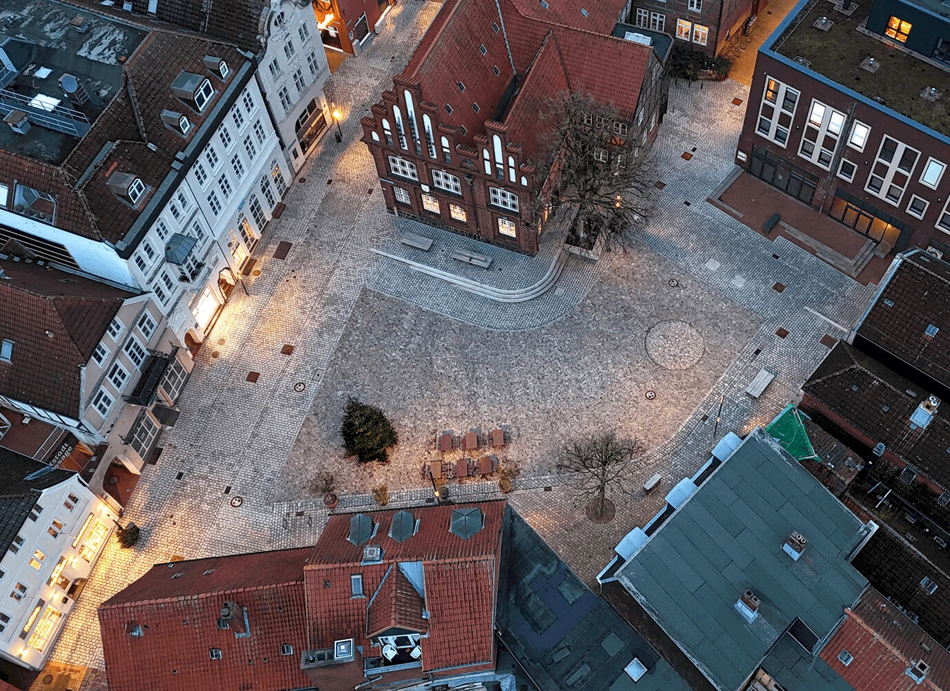 Neuerburgs Lage im Tal, der an der Mühle stürzenden Enz, das feuchte Moos im dichten Wald, nach dem Aufstieg der Blick auf die kompakte Stadt überragt durch Kirche und Burg: Ein Spaziergang offenbart die teils versteckten Schätze rund um die kompakte Altstadt und ihren ‚neuen‘ Marktplatz. Wir verstehen ihn als Herzstück der Stadt - im Alltag wie auch bei Festen. Die Neuerburger Altstadt wurde über einen einheitlichen Pflasterteppich als Ganzes zusammengefügt. Ein hochwertiges und präzise eingepasstes ‚Tableau‘ akzentuiert die Platzmitte. Durch einen warmgrauen Plattenbelag wird diese als Bühne des städtischen Lebens gestärkt. Der Maßstab des an dieser Stelle vormals bebauten Stadtraums wird so als freie Interpretation wieder lesbar. An den Längsseiten unterstützen Bäume und Bankreihen die räumliche Fassung des Tableaus. Im lichten Schatten bieten großzügige Bänke und locker gestellte Sessel hohe Verweilqualität nach ‚Innen und Außen‘ und dabei beste Aussicht auf die umgebende Stadt- und Eifellandschaft. Der schmale, rauschende Fluss im Tal und der raue Schiefer an den steilen Talhängen inspirieren zu einer besonderen vegetativen Intarsie, die leicht erhaben als ‚Zitat der Landschaft‘ einen grünen Akzent bildet. Das niveaugleiche ‚Neuerburger Brunnenspiel‘ bildet einen spielerischen und belebenden Moment auf dem Platz.