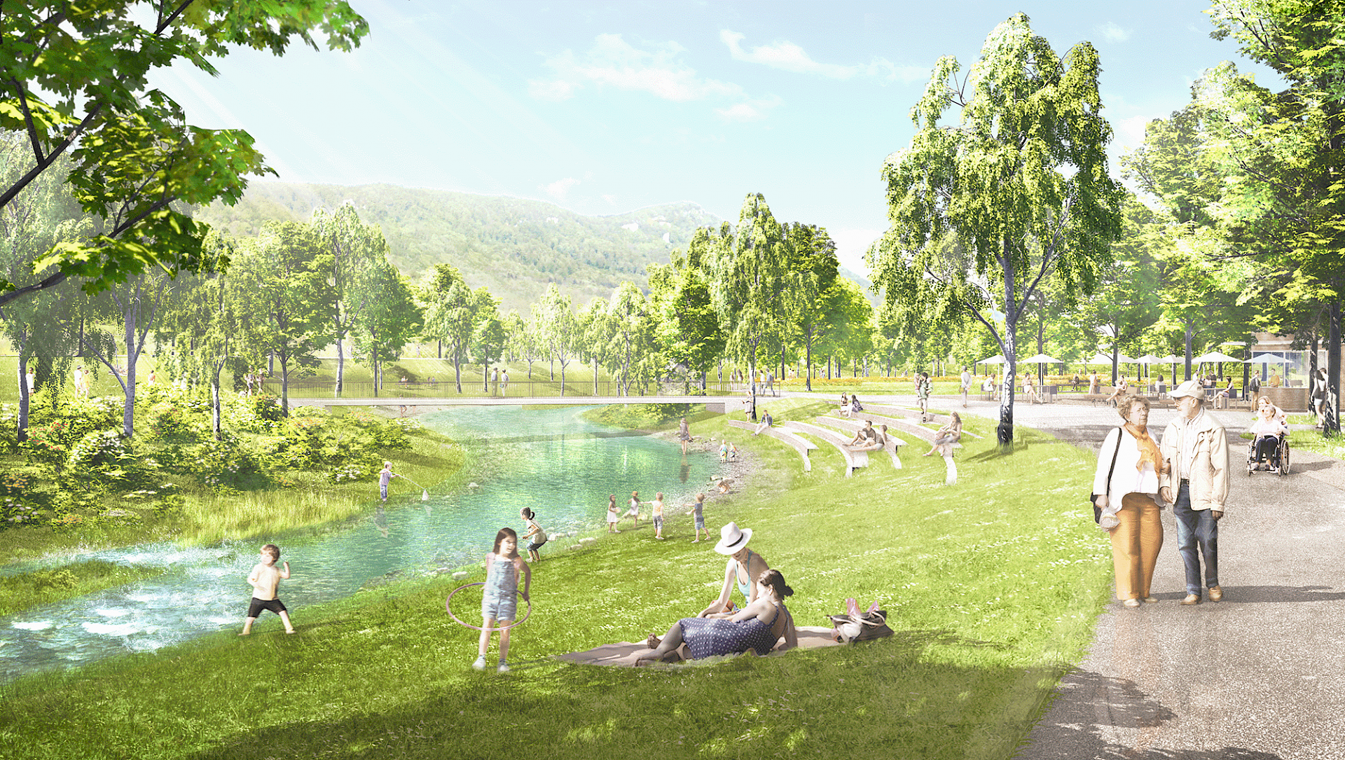 In the transition between the elongated settlement area of Bad Urach in the valley and the adjoining landscape space characterised by open expanses, a variety of park spaces are created along the swinging blue ribbon of the Erms. Each one is spatially and atmospherically independent and characteristic in terms of its inventory, offerings and situations along the river. The discovering walk along the Erms, through the upgraded spa park and "the two new ones" offers a sequence of impressively intense experiences as well as an interplay of small-scale, diverse situations and generously open meadow images, connected by a pathway developed from the existing ones. Between the Kurpark, Bürgerpark and Auenpark, this is qualified in its profile and accentuated by the accompanying squares and bridges as a circular loop. The "Spielspange" in the Bürgerpark in front of the new development and the "Kurspange" between the Graf Eberhard Hotel, the thermal baths and the Ermstalhalle form special places and link the fine network of paths, as well as other "Urach path nodes", to the surrounding urban and landscape space.