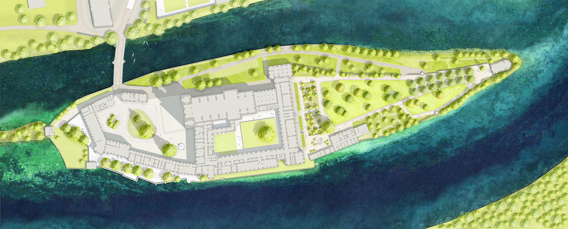 The monastery and its gardens, the entire island of Rheinau - built on and on over centuries and centuries - form a unique ensemble of layers of time, (open) spaces and different atmospheres. Each specific and impressive, they complement each other and act as an overall picture. The open space concept for the north shore of the island and the Spitzgarten establishes the reference to the multifaceted history and carefully continues to write the valuable open spaces from the inventory in a future-oriented way. Starting from the Rhine bridge, the accessibility and connection of the Spitzgarten is qualified by a direct promenade path with a slight curve. Precise interventions in the existing path of the Spitzgarten create a generously free and pleasantly simple lawn center, which spatially balances and holds together the set pieces from different time layers. A simple yet differentiated circular path circles the garden within the walls and opens up the subspaces - the walk through Spitzgarten as a loop and 'journey through time'.